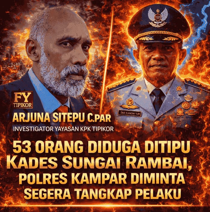 Kampar, Riau — Dugaan penipuan dan penggelapan gaji perangkat desa kembali mencuat. Sebanyak 53 orang yang terdiri dari unsur aparatur dan tokoh masyarakat Desa Sungai Rambai, Kecamatan Kampar Kiri, melaporkan Kepala Desa Sungai Rambai, Dedi Kandar SY, ke Polres Kampar pada Senin (23/02/2026).