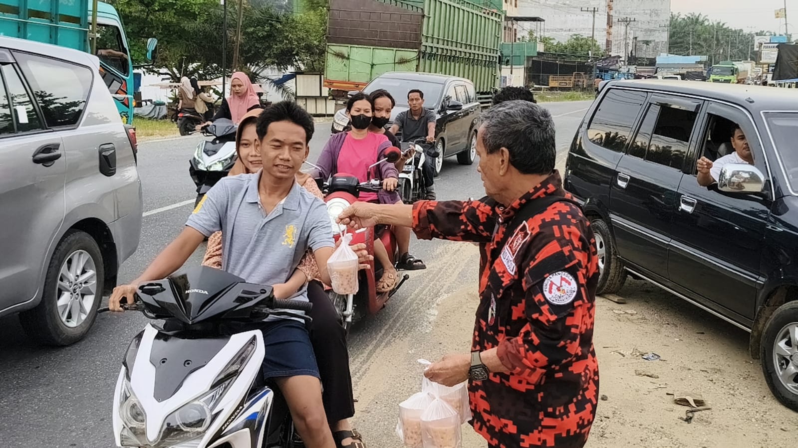 Sejumlah pengendara memilih berhenti sejenak untuk menerima paket takjil sebagai bekal berbuka puasa di perjalanan.