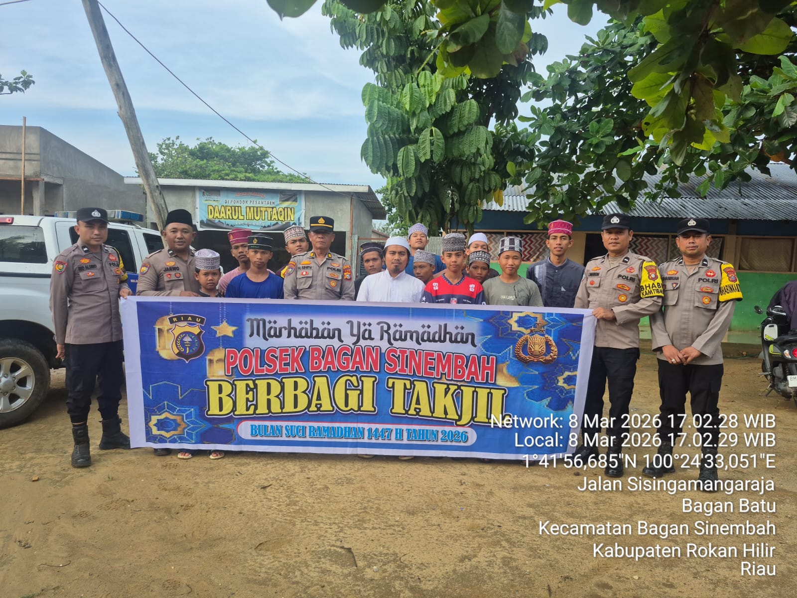 ROKAN HILIR – Dalam rangka menyemarakkan Bulan Suci Ramadhan 1447 H / 2026 M, Polsek Bagan Sinembah Polres Rokan Hilir melaksanakan kegiatan berbagi takjil kepada masyarakat, Minggu (08/03/2026) sore.