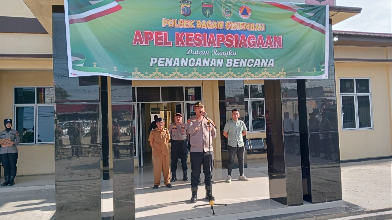 BAGAN SINEMBAH, ROHIL – Polsek Bagan Sinembah menggelar apel kesiapsiagaan penanganan bencana di halaman Mapolsek Bagan Sinembah, Minggu (30/11/2025). Apel ini bertujuan untuk menyinergikan seluruh elemen masyarakat, pemerintah, TNI, Polri, BPBD, Basarnas, dan pihak swasta dalam menghadapi potensi bencana di wilayah hukum Polsek Bagan Sinembah, khususnya saat musim penghujan.