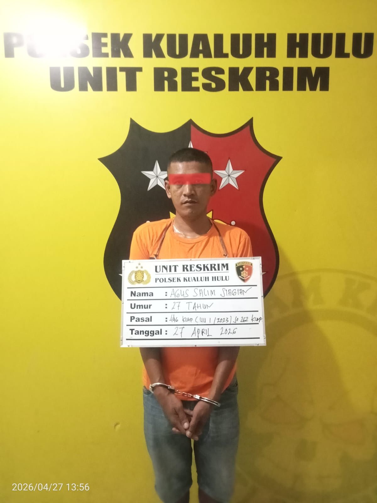 Agus Salim Siagian. Jenis kelamin Laki laki umur 27 Tahun, agama Islam, pekerjaan Belum Bekerja, alamat Lingk XII atas Kelurahan Gunting Saga Kecamatan Kualuh Hulu Kabupaten Labuhanbatu Utara.