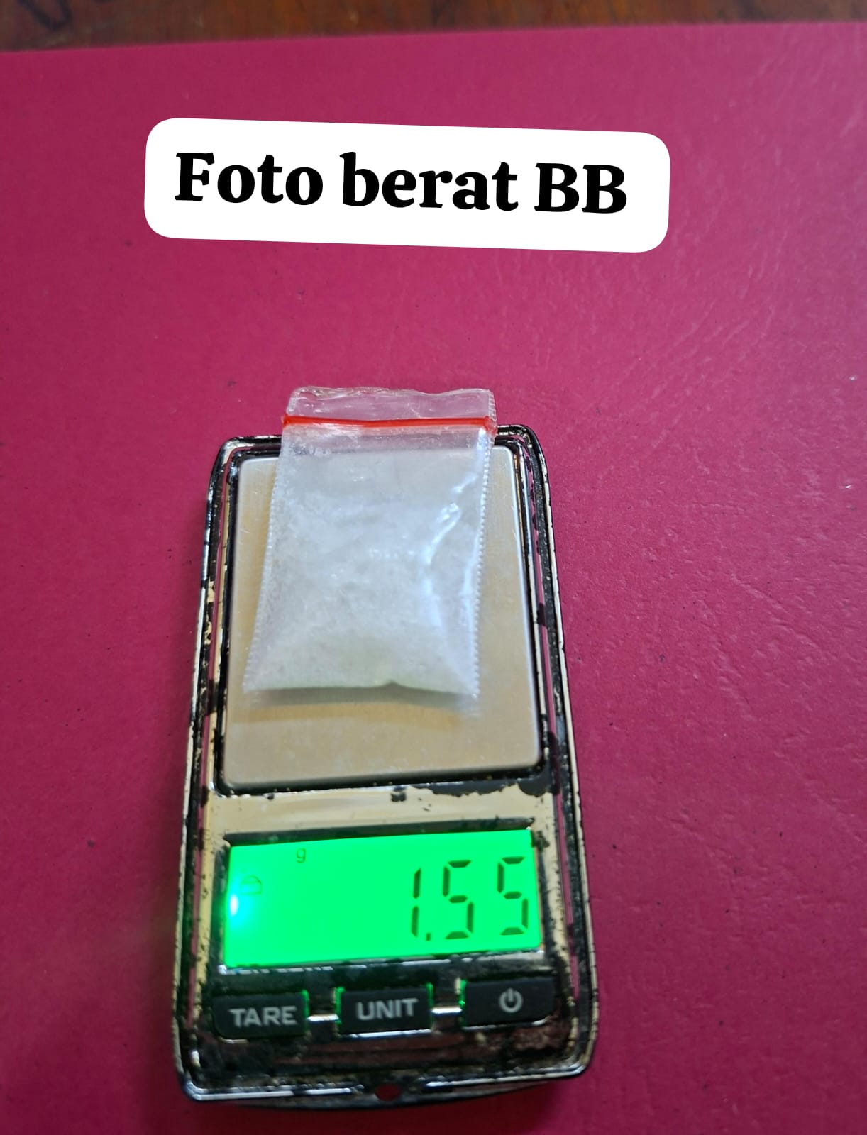 Dari hasil penangkapan, petugas menemukan barang bukti berupa satu paket plastik bening berisi kristal diduga shabu serta satu unit handphone merk Infinix warna hitam yang digunakan sebagai sarana komunikasi dalam transaksi. Saat diinterogasi, tersangka mengakui bahwa barang haram tersebut adalah miliknya yang rencananya akan diedarkan.